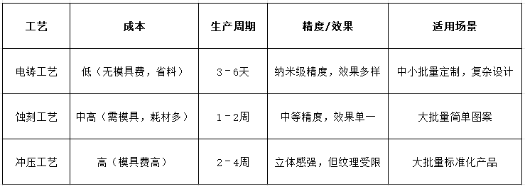 表面粗糙度可達納米級,圖形邊緣光滑無毛刺,支持復(fù)雜效果(立體凸字、鏡面、拉絲紋、十字紋等)。