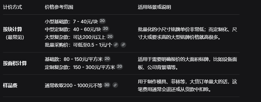 簡(jiǎn)單的道理:尺寸越大,材料和加工成本越高。同時(shí),異形或非常規(guī)形狀的銘牌可能需要額外的模具費(fèi)或沖切工序,也會(huì)推高價(jià)格。